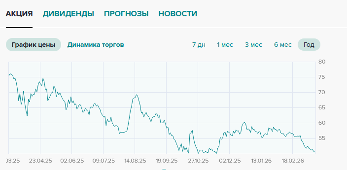 - Зафиксировать прибыль. За последний год акции снизились на 33,79%, но аналитики видят потенциал роста до 64–70 рублей.
