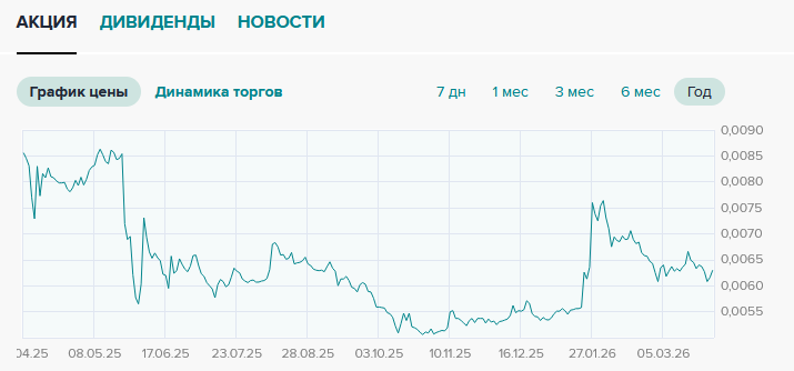 - Цена акций. В последние месяцы цена немного выросла. Технические графики показывают, что цена стабилизировалась и может продолжить рост, если не опустится ниже 0,0067 рубля.
